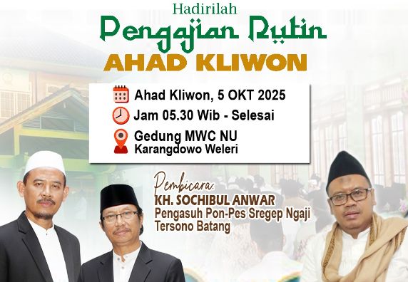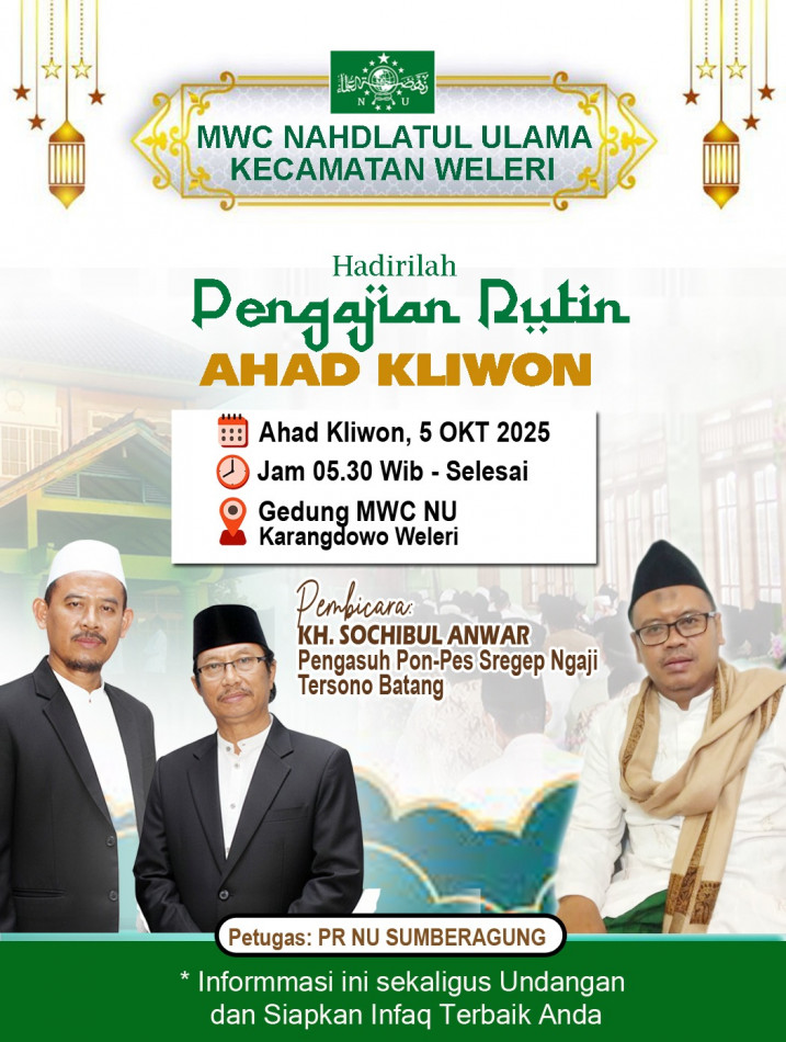 BUMIAYU- Diberitahukan kepada seluruh warga dan jamaah Nahdlatul Ulama di wilayah Kecamatan Weleri dan sekitarnya, bahwa Majelis Wakil Cabang Nahdlatul Ulama (MWC NU) Kecamatan Weleri akan menyelenggarakan Pengajian Rutin Ahad Kliwon pada: