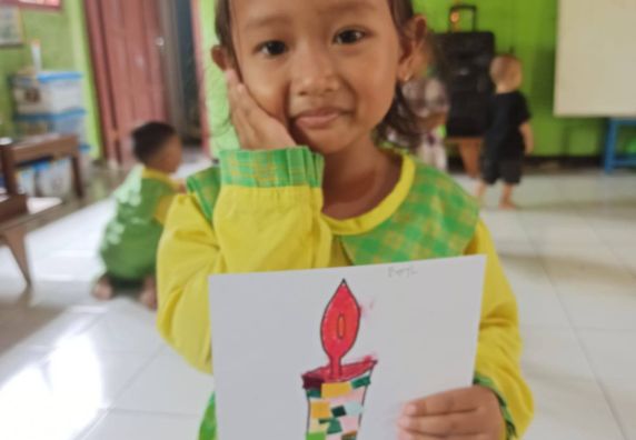 Dalam kegiatan ini, guru pendamping terlebih dahulu memberikan contoh gambar lilin sederhana. Anak-anak kemudian diberi bahan berupa kertas warna, gunting, dan lem untuk ditempelkan sehingga membentuk karya kolase sesuai imajinasi mereka. Meski sederhana, kegiatan ini menjadi sarana penting bagi tumbuh kembang anak, terutama dalam melatih kesabaran, ketelitian, serta koordinasi mata dan tangan.